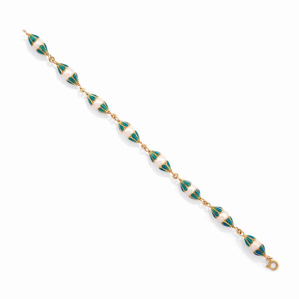 maglia a losanghe con perle coltivate di mm 8,00 circa entro coppiglie decorate in smalto verde.