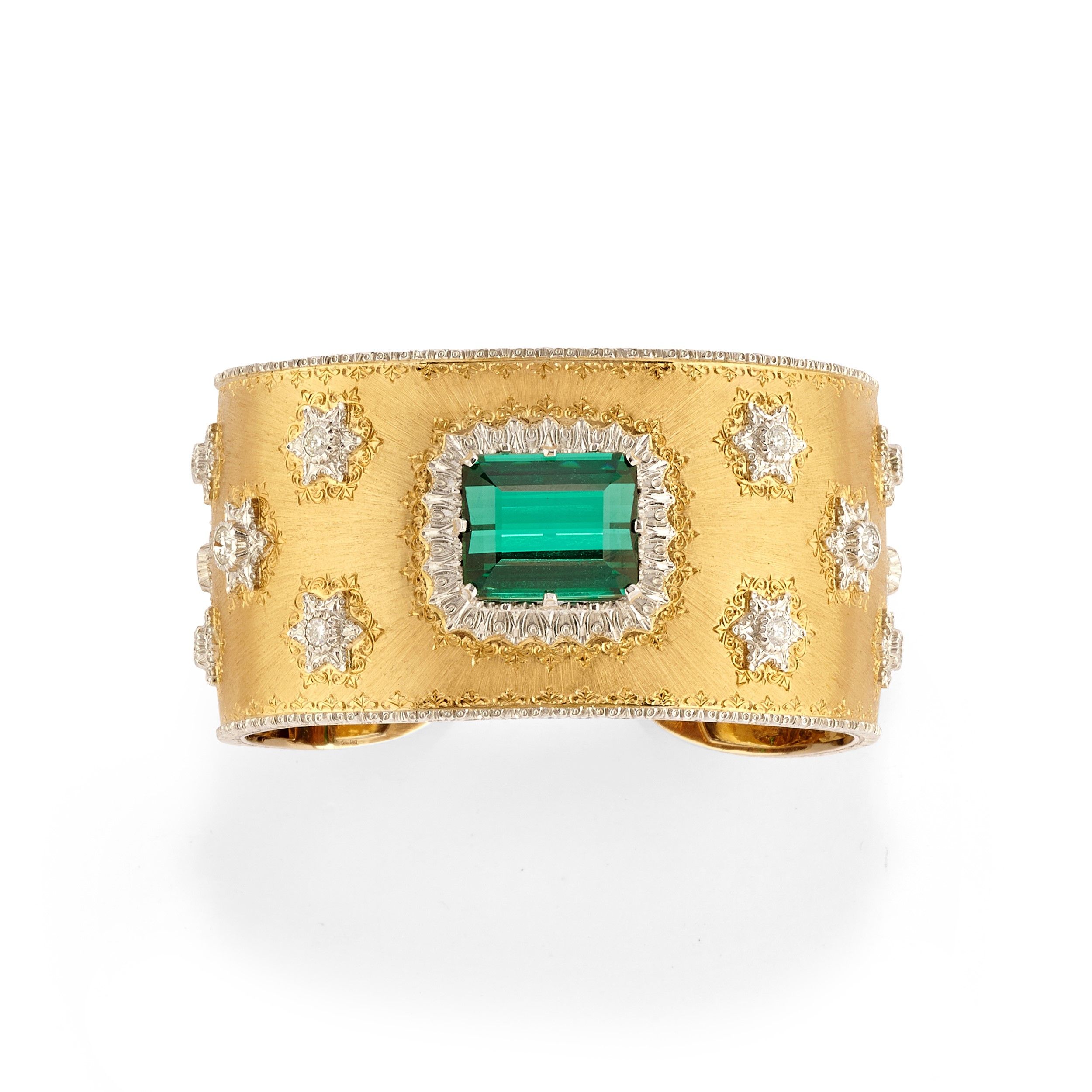 a schiava, fondo satinato con motivi a fiore impreziositi da diamanti taglio brillante per totale ct 4,400 circa, al centro grande tormalina verde taglio rettangolare a contorno ottagonale.