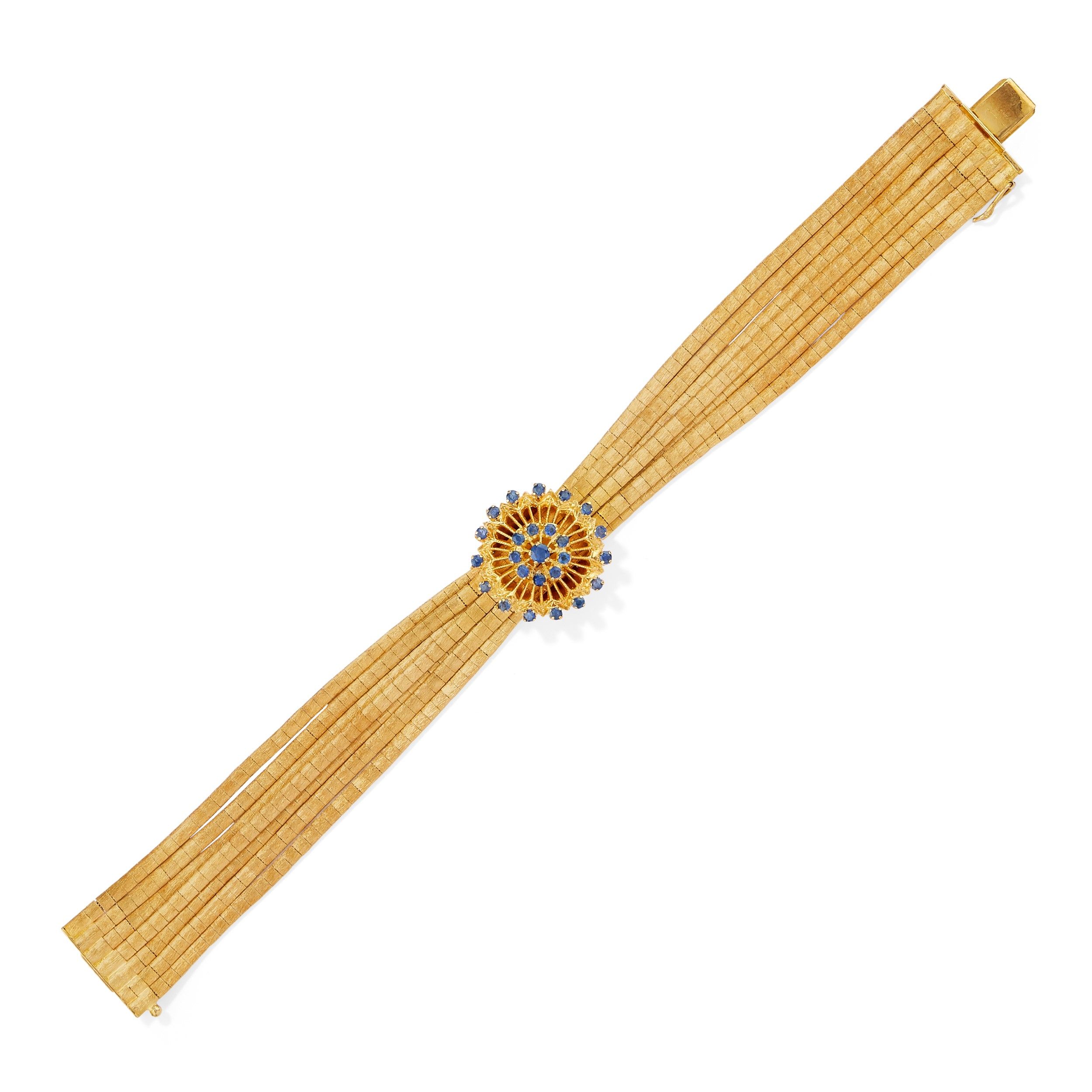 a sette fili d'oro satinato con al centro inserto impreziosito da zaffiri taglio rotondo.