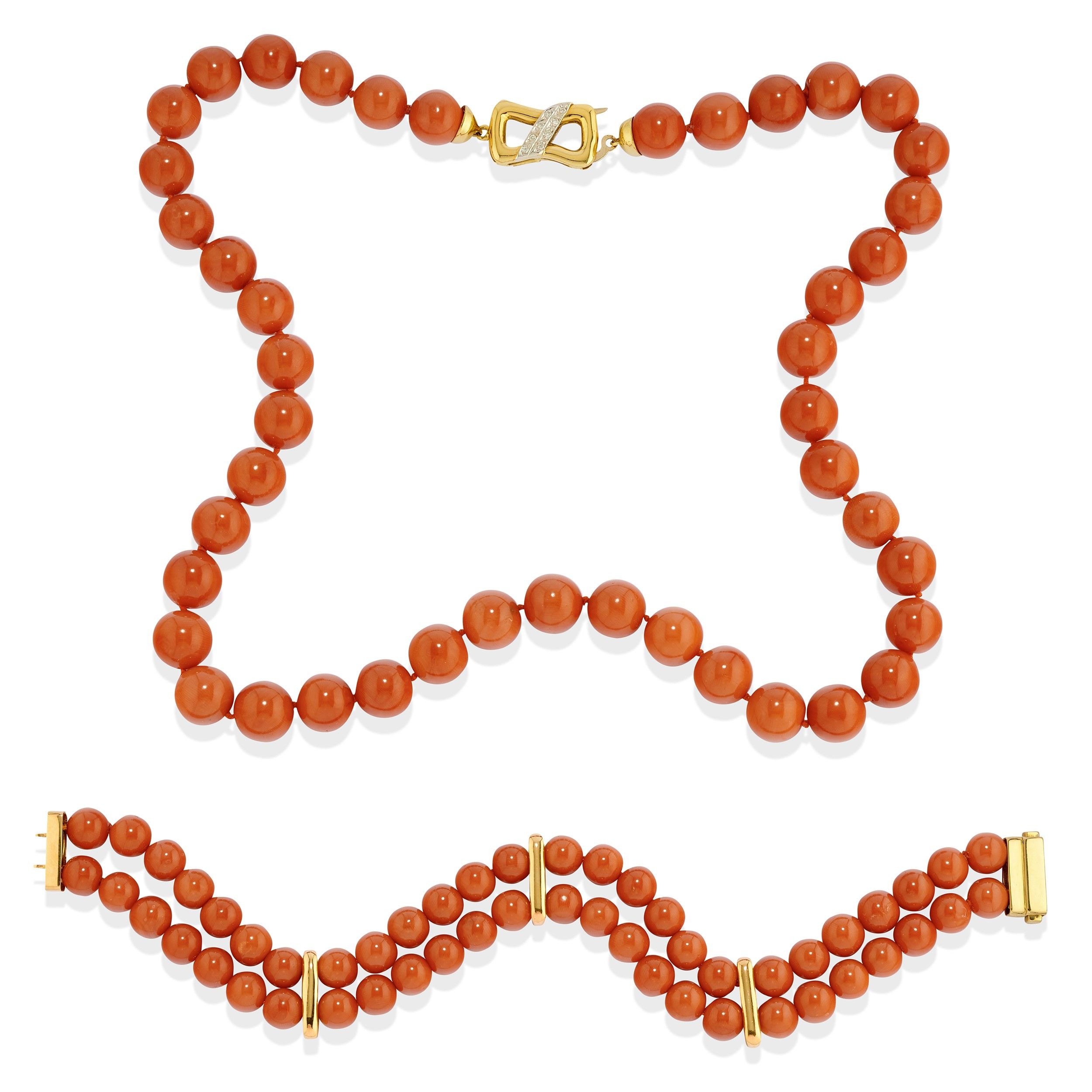 bracciale a due fili di boules di mm 8,00 circa e collana a un filo di boules di mm 11,00 circa con chiusura impreziosita da piccoli diamanti taglio brillante.