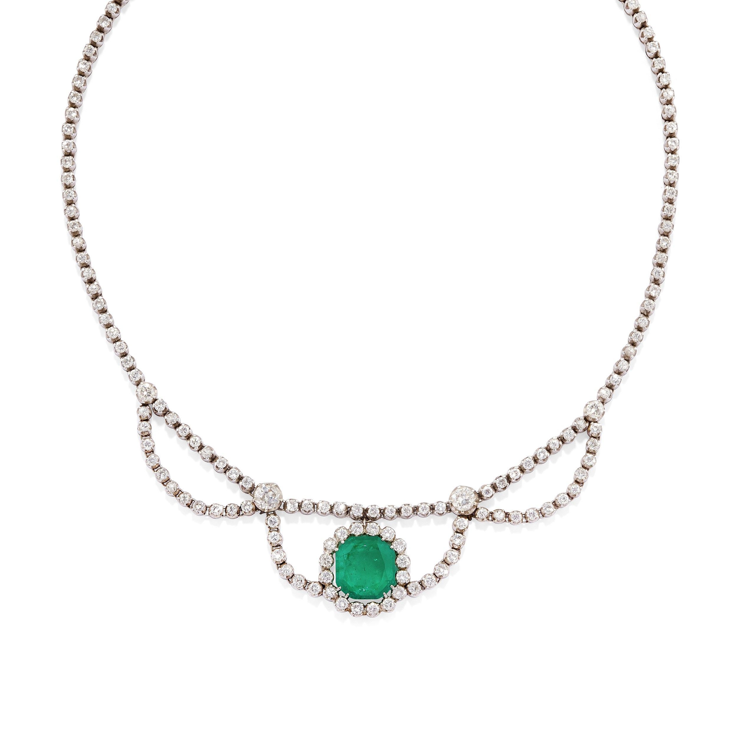 a bavaglino con al centro smeraldo Colombia taglio ottagonale a gradini di ct 6,50 circa, ai lati due diamanti taglio brillante per totale ct 1,05 circa, prob. colore J/K, purezza SI/P, contorno in diamanti taglio brillante per totale ct 8,50 circa, prob. colore H/K, purezza VS/SI, difetti (quattro diamanti presentano piccole mancanze di materiale sulla cintura).