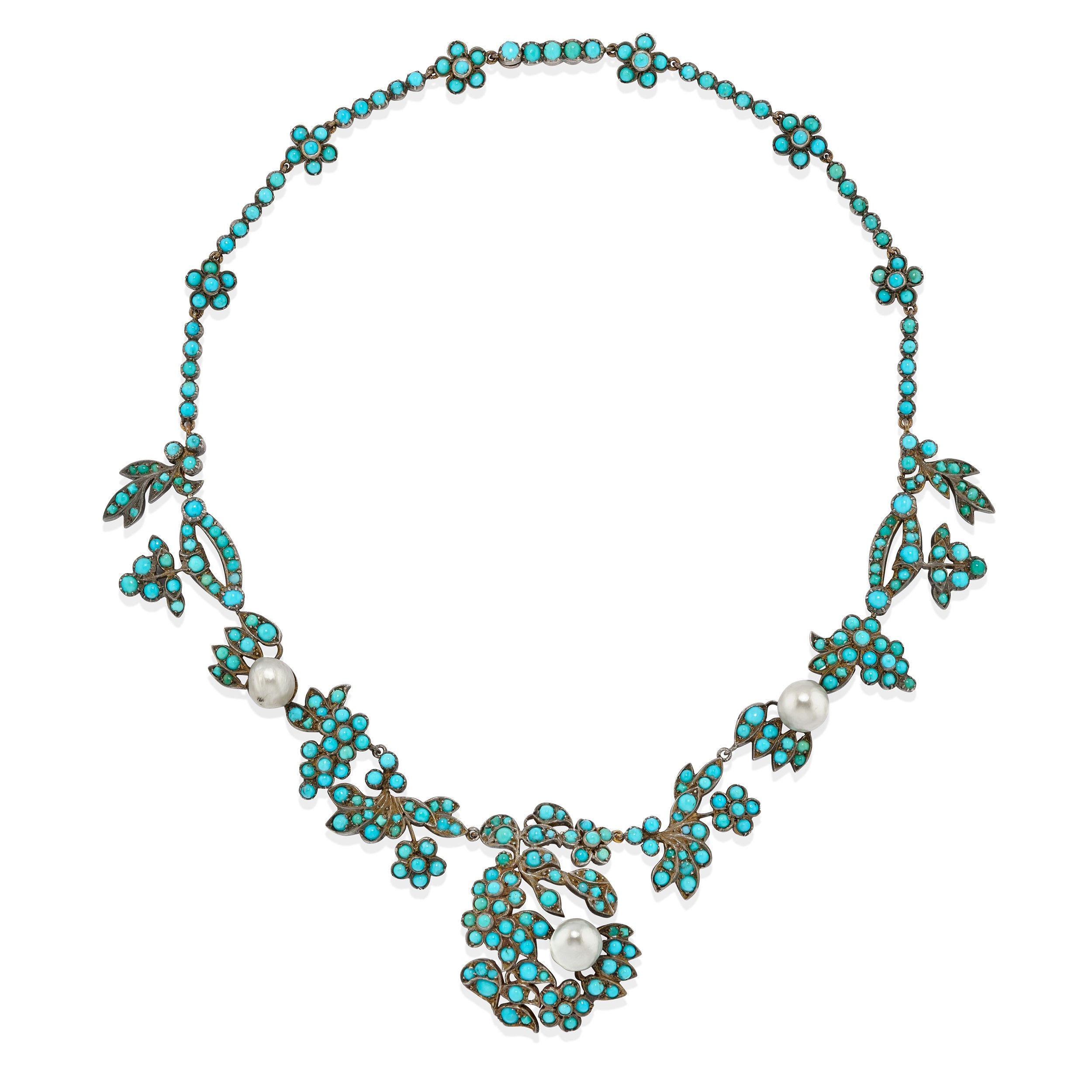 XIX secolo realizzata con decoro floreale in turchesi taglio rotondo cabochon e perle naturali di acqua salata.
