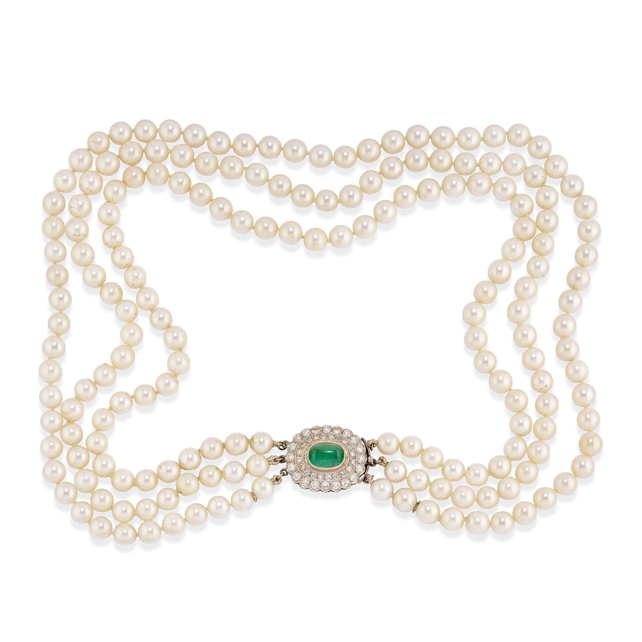 a tre file di perle coltivate di mm 7,50/8,00, con chiusura centrata da smeraldo taglio ovale cabochon entro doppia cornice in diamanti taglio huit-huit e brillante per totale ct. 3,00 circa.