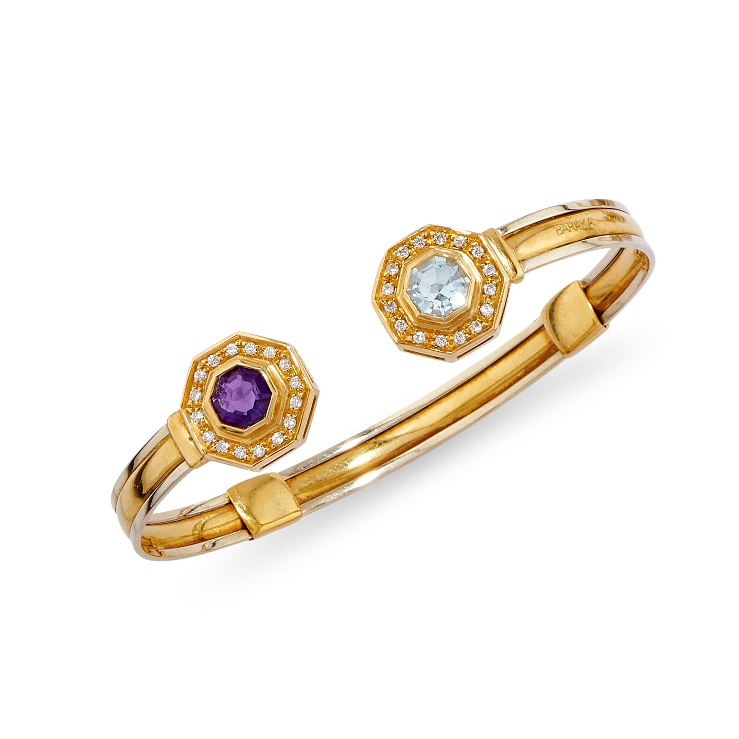 realizzata con maglia groumette e al centro tre settori impreziositi da pietre di colore, diamanti taglio brillante per totale ct 1,50 circa, bracciale rigido con terminali in pietre colorate, contorno in diamanti taglio brillante per totale ct 0,60 circa.