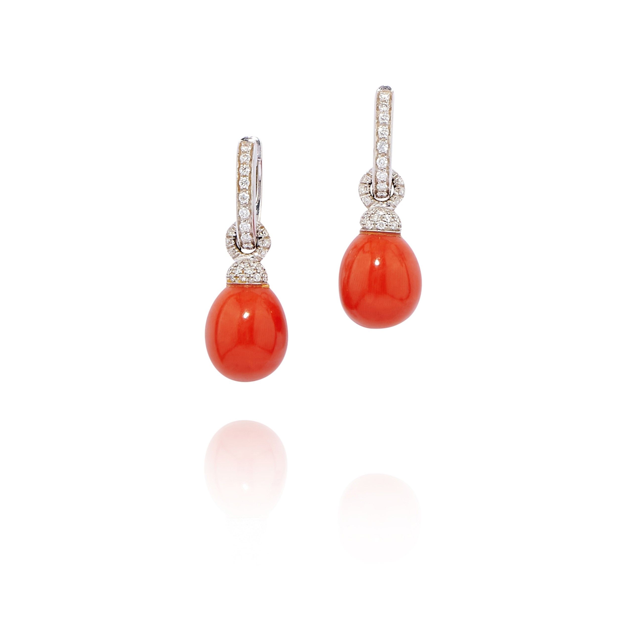 composta da orecchini con goccia in corallo e diamanti taglio brillante per totale ct 0,50 circa, chiusura perno e clip, collezione Joyful, bracciale con boules in corallo e diamanti taglio brillante per totale ct 1,00, collezione Cherie.