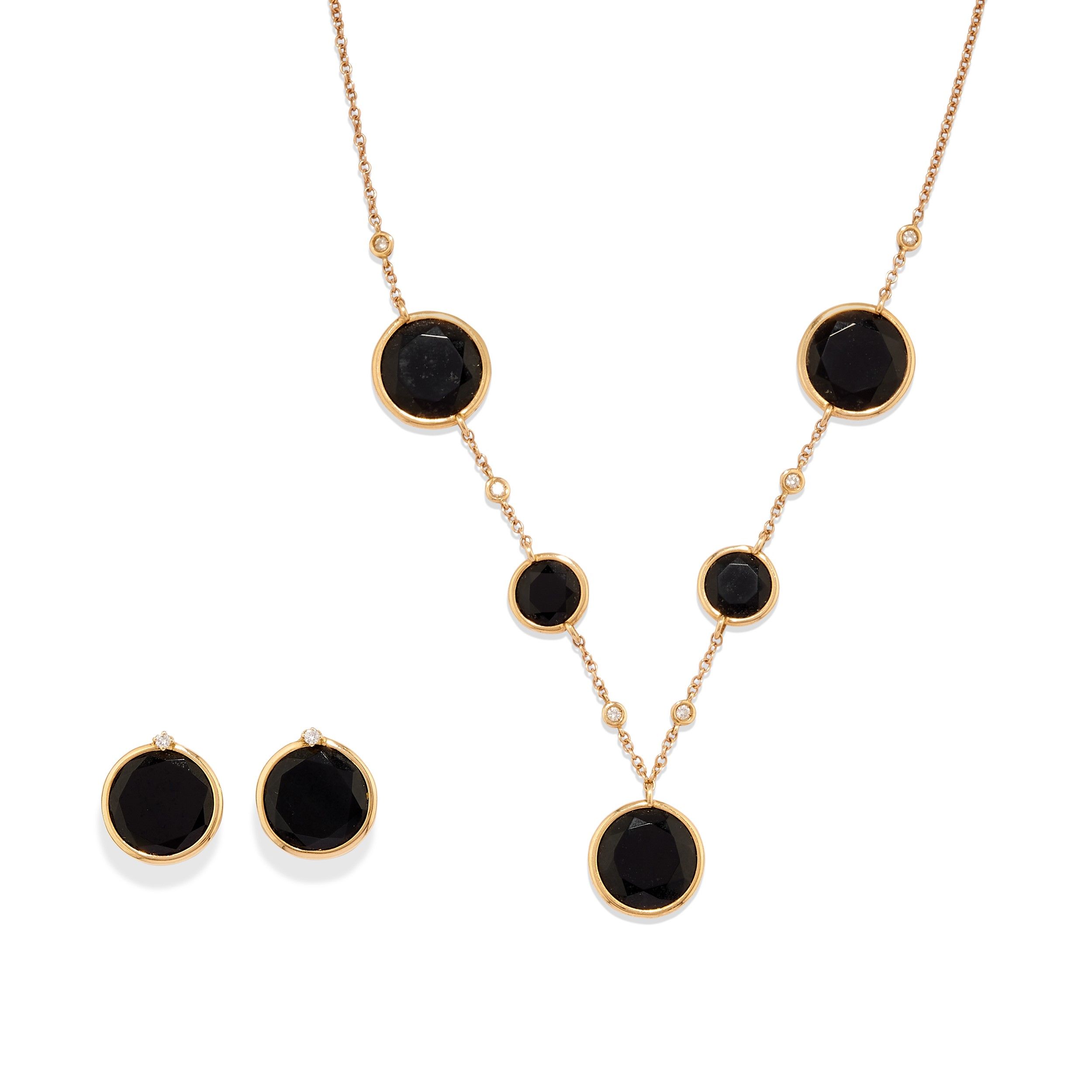 composta da collana e coppia di orecchini con chiusura perno e farfalla, realizzati con dischi in onice sfaccettati e piccoli diamanti taglio brillante per totale ct 0,30 circa.