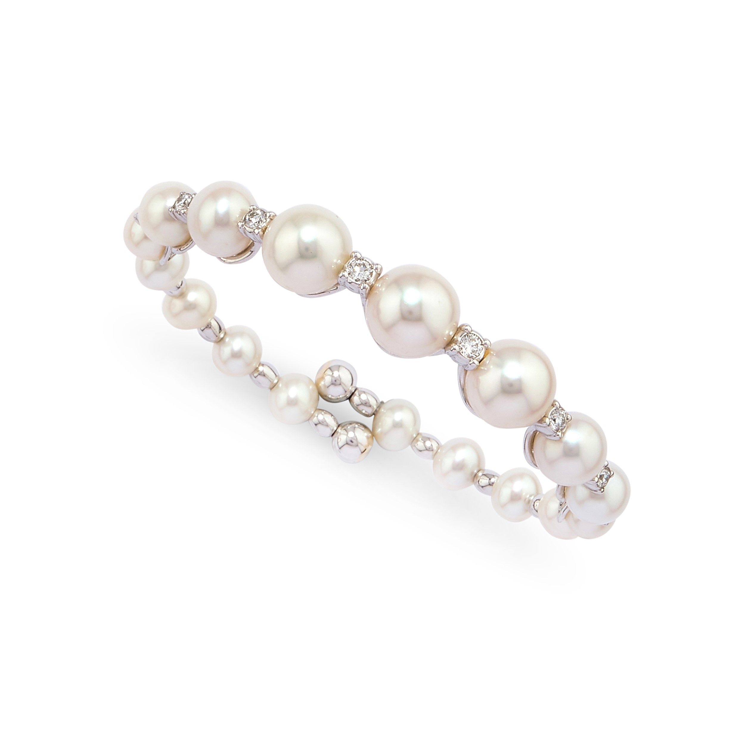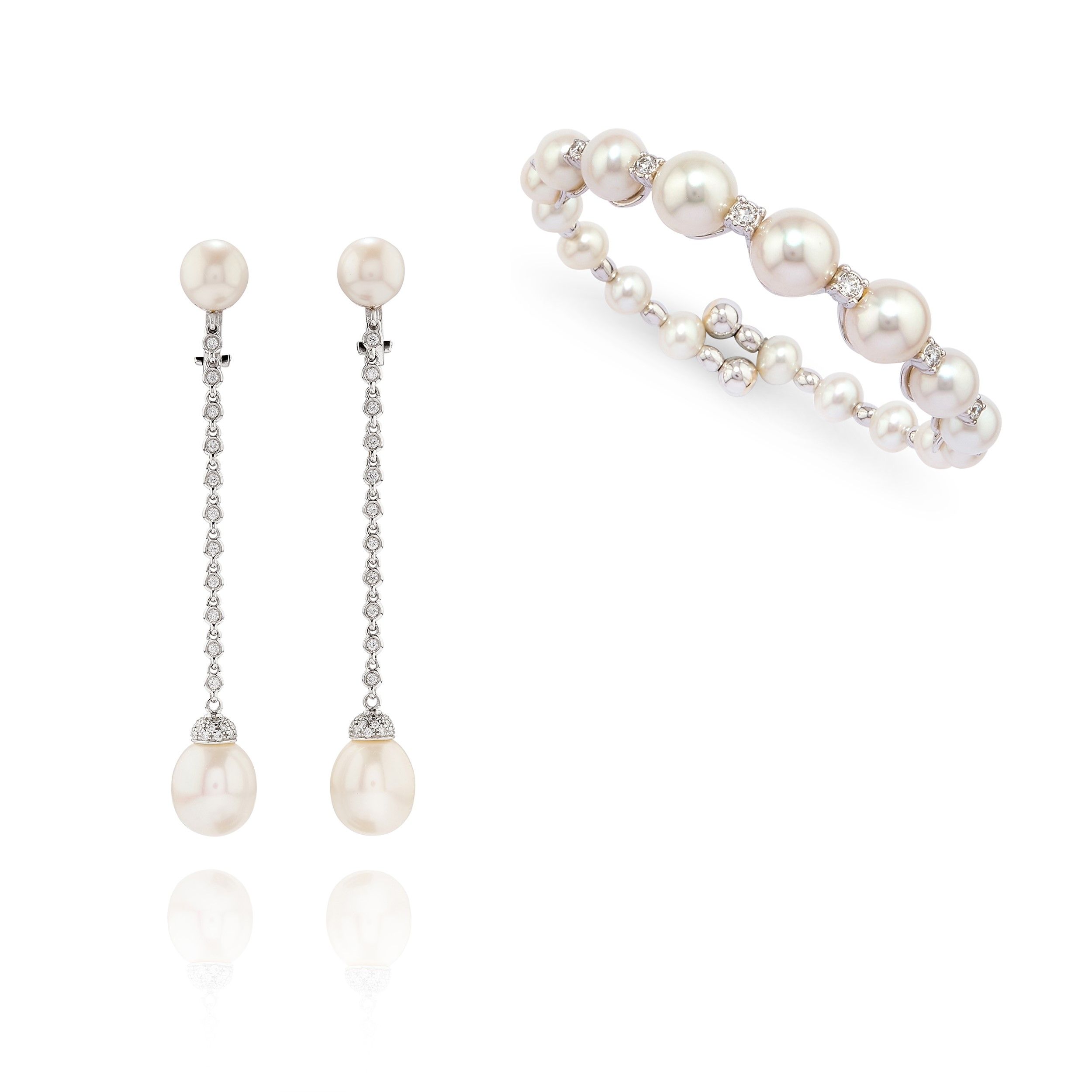 in oro bianco 18k, Peso g 32,70 cm 7,00 composta da bracciale con maglia elasticizzata con perle coltivate e diamanti taglio brillante per totale ct 1,00 circa, collezione Cherie ed orecchini pendenti con perle coltivate e diamanti taglio brillante per totale ct 0,70 circa, chiusura perno e clip, collezione Joyful.