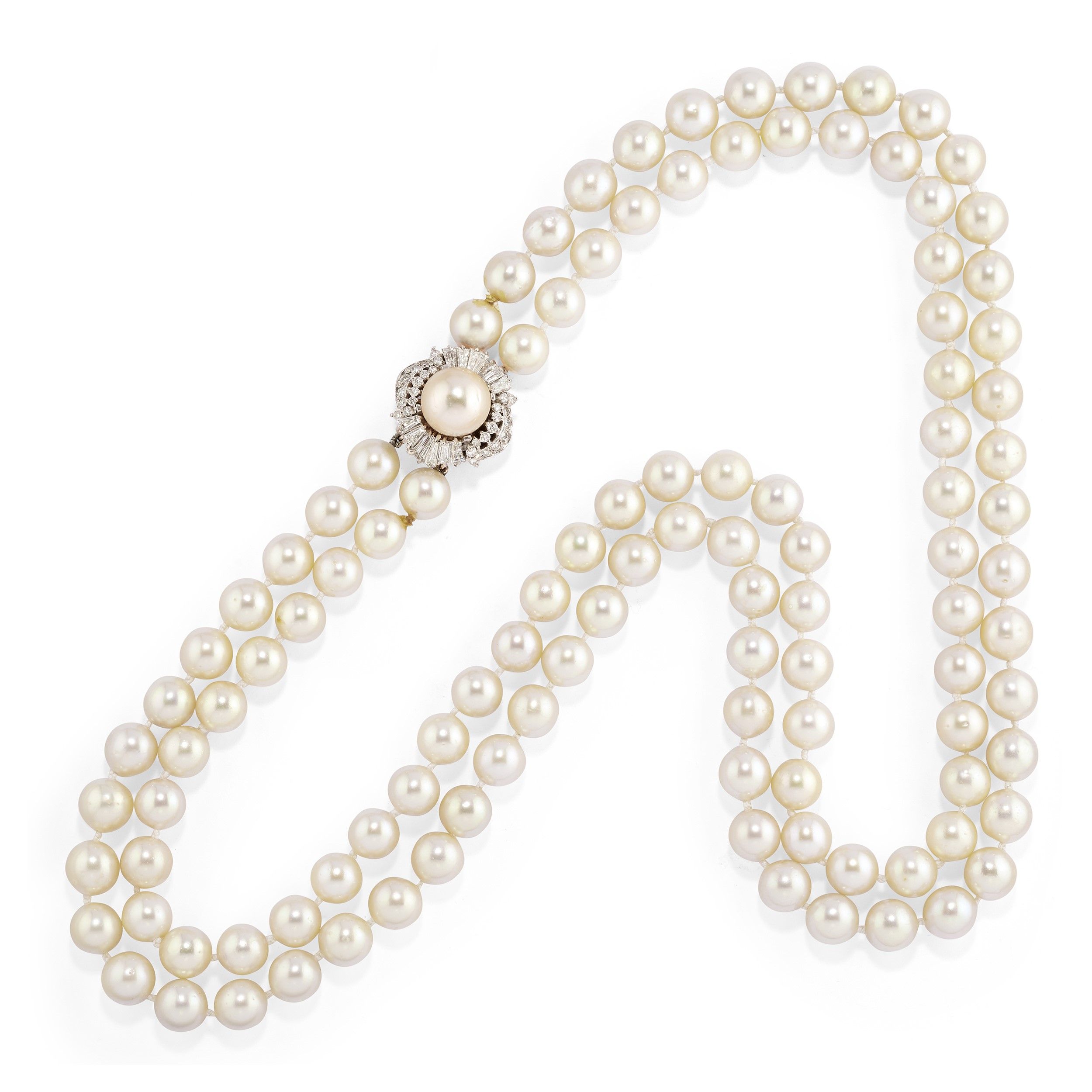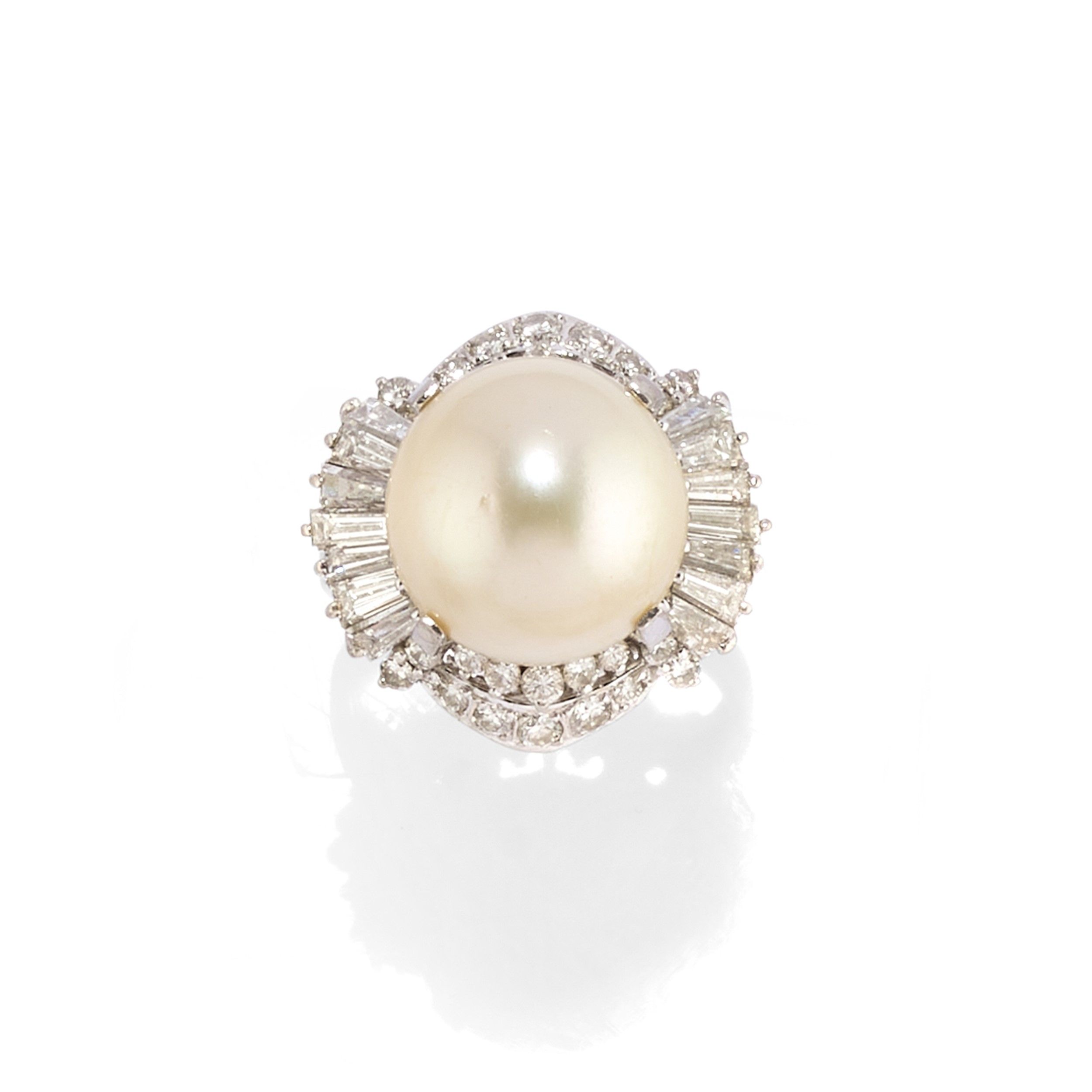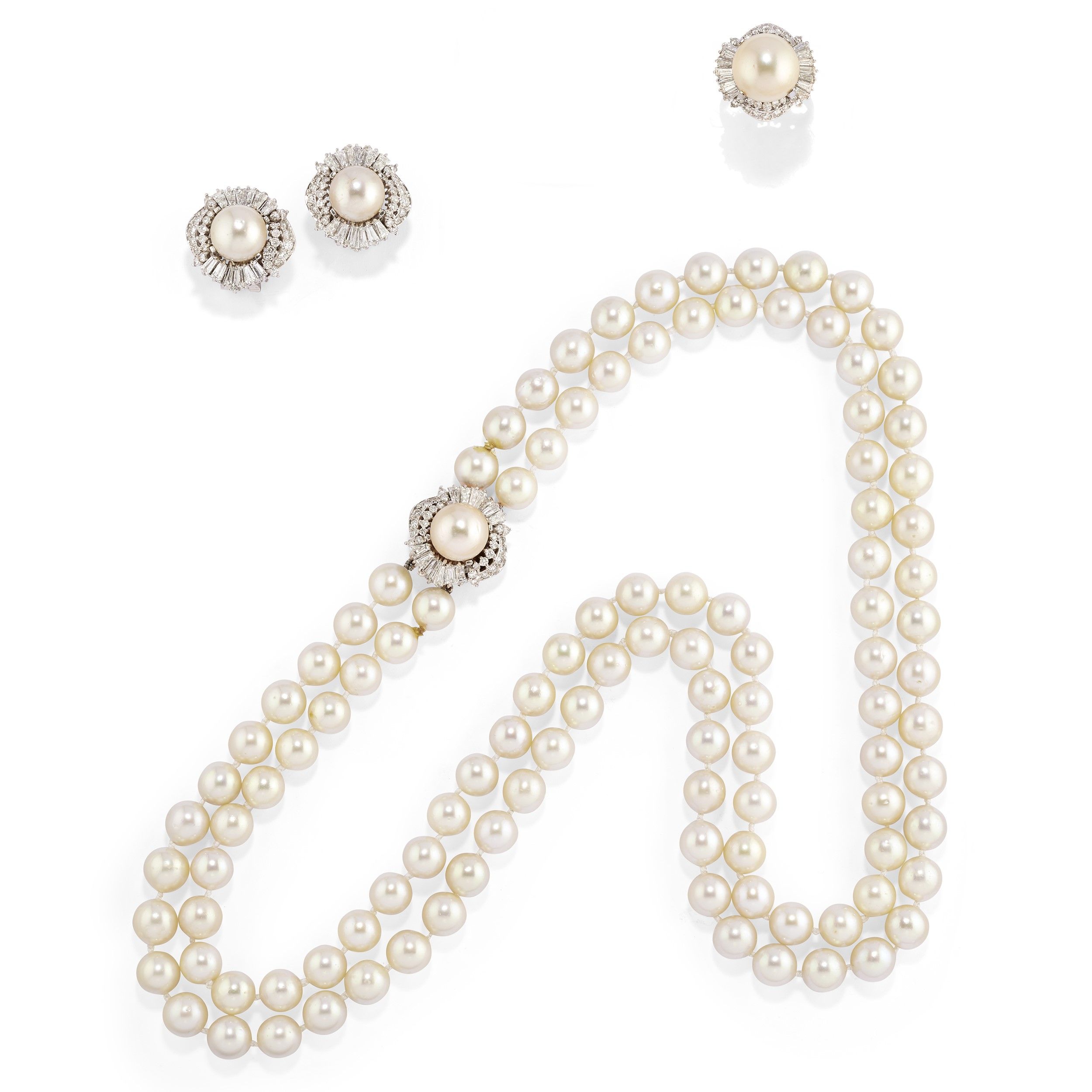 composta da anello, coppia di orecchini con chiusura perno, clip e farfalla e da collana a due fili, realizzata con perle coltivate da mm 9,00/15,00 circa, diamanti taglio brillante e tapered baguette per totale ct 8,00 circa.