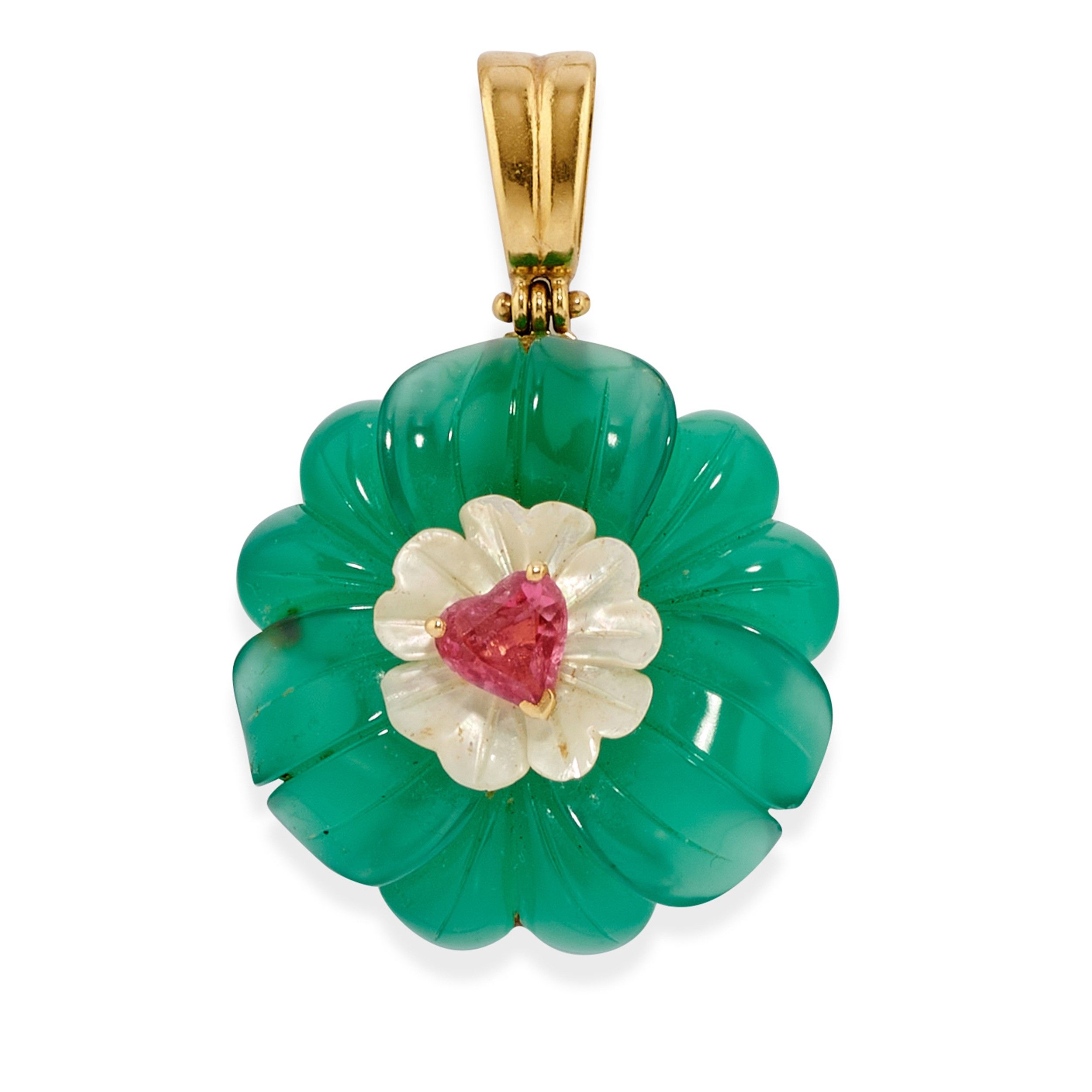 composta da pendente e coppia di orecchini con chiusura a clip, motivi a fiore in madreperla, crisoprasio e tormalina rosa.