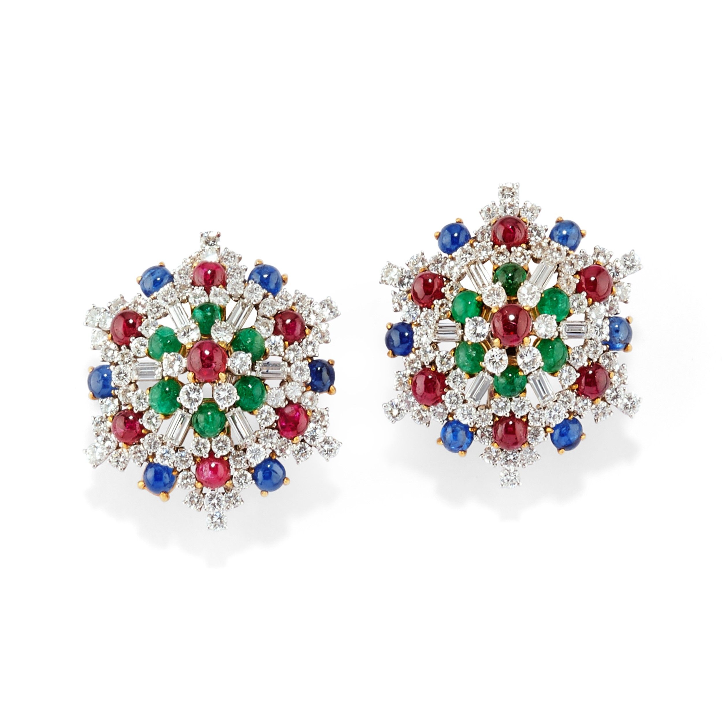 composta da spilla e coppia di orecchini con chiusura a clip, motivo a fiore con rubini, zaffiri e smeraldo taglio rotondo e ovale per totale ct 20,00 circa e diamanti taglio brillante e baguette per totale ct 15,00 circa, difetti (visibile mancanza di materiale in corrispondenza di un piccolo smeraldo).