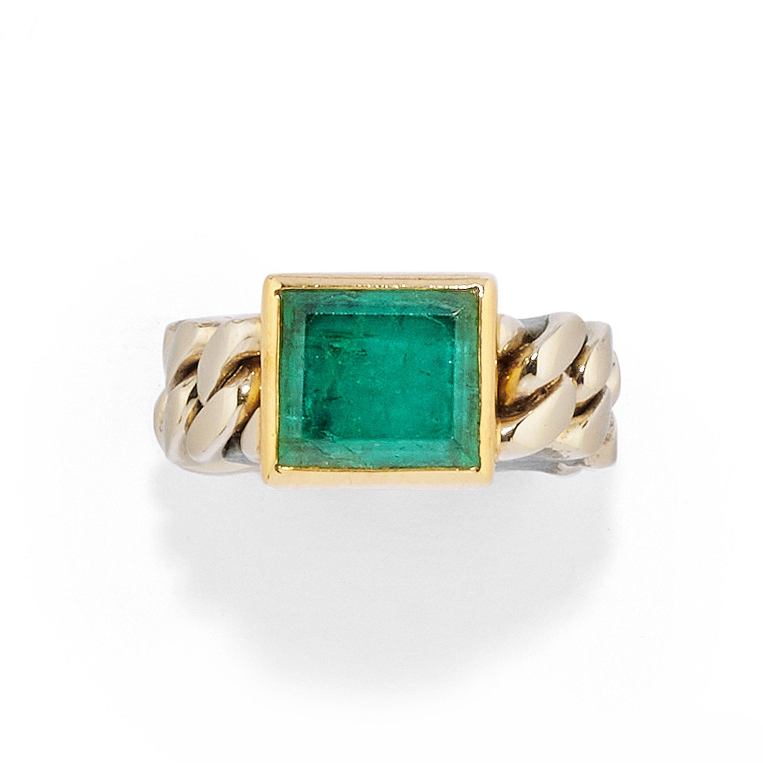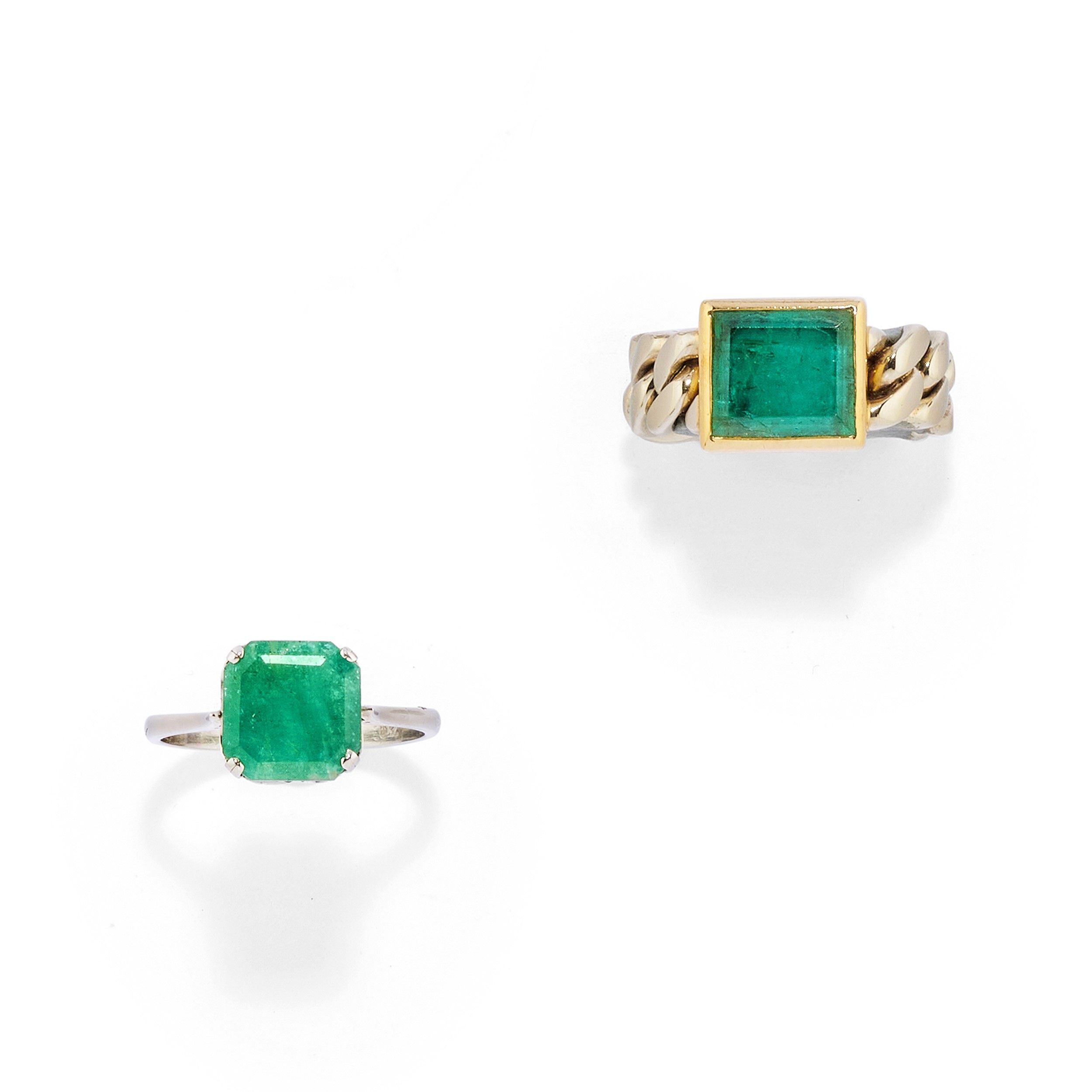 uno a quattro griffes con smeraldo taglio rettangolare a contorno ottagonale, l'altro con maglia a groumette e smeraldo taglio rettangolare.