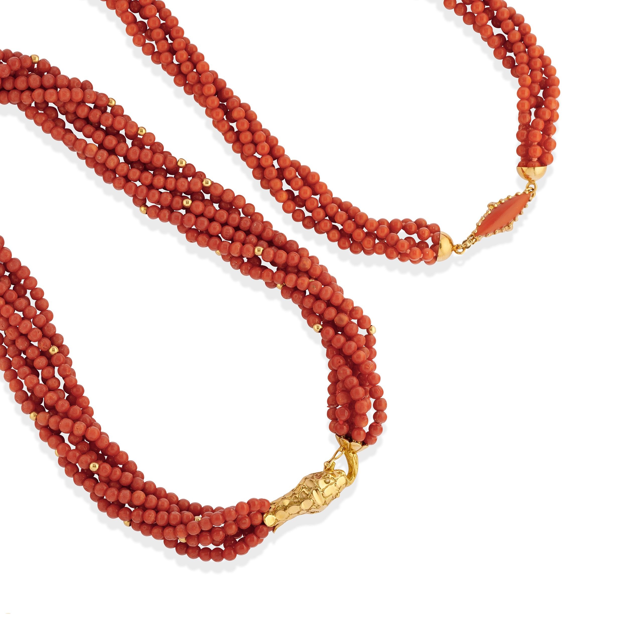 in oro giallo 18k, Peso g 160,00 cm 45,00-45,50 una a cinque fili di boules di corallo di mm 4,00 circa e chiusura impreziosita da corallo taglio marquise, una a sette fili di boules di corallo di mm 4,50 circa alternate a sfere in oro, chiusura a testa di serpente.