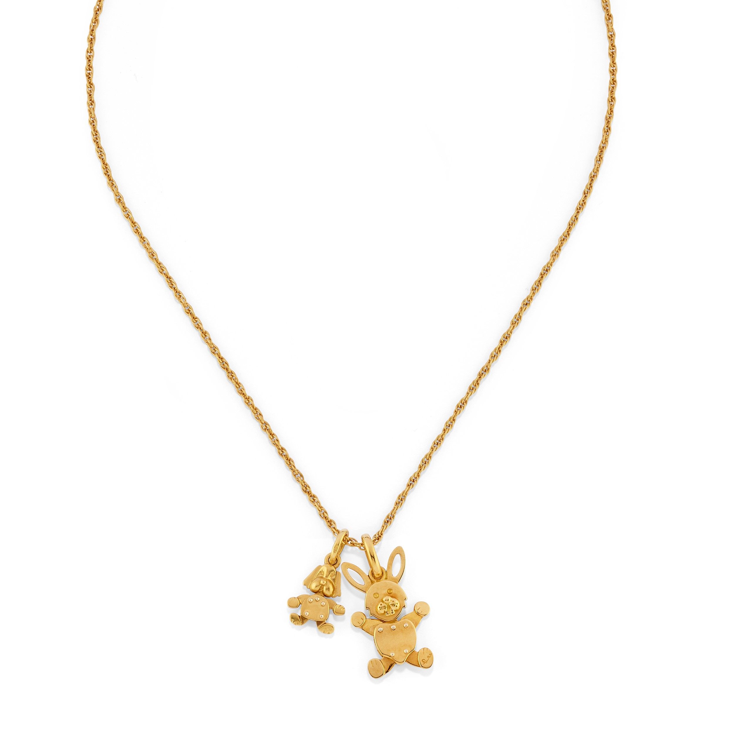 raffiguranti coniglio e cagnolino trattenuti da collana non firmata.