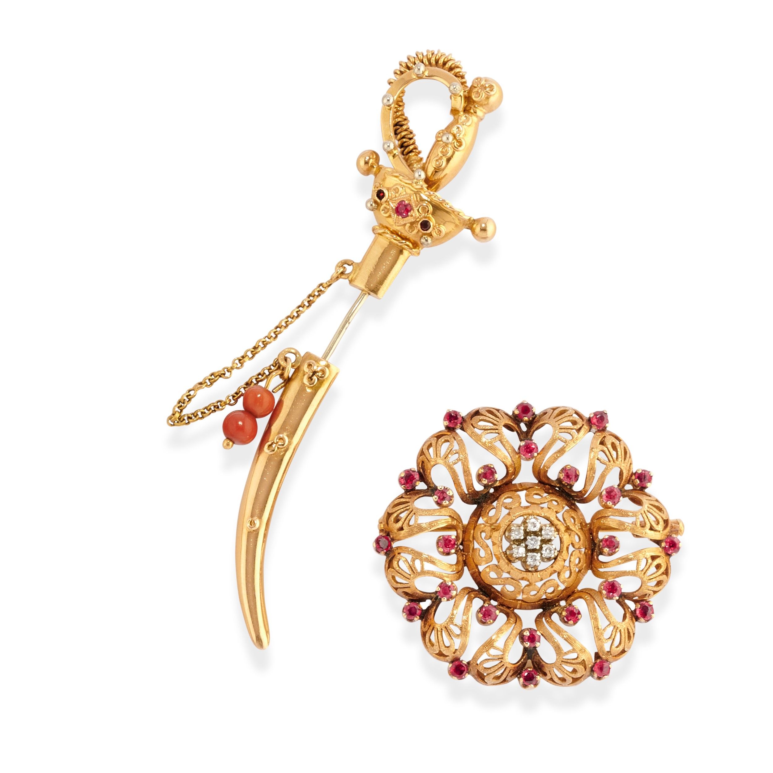 una a forma di spada con rubino, granati e corallo, una di forma rotonda con rubini taglio rotondo e diamanti taglio huit-huit.