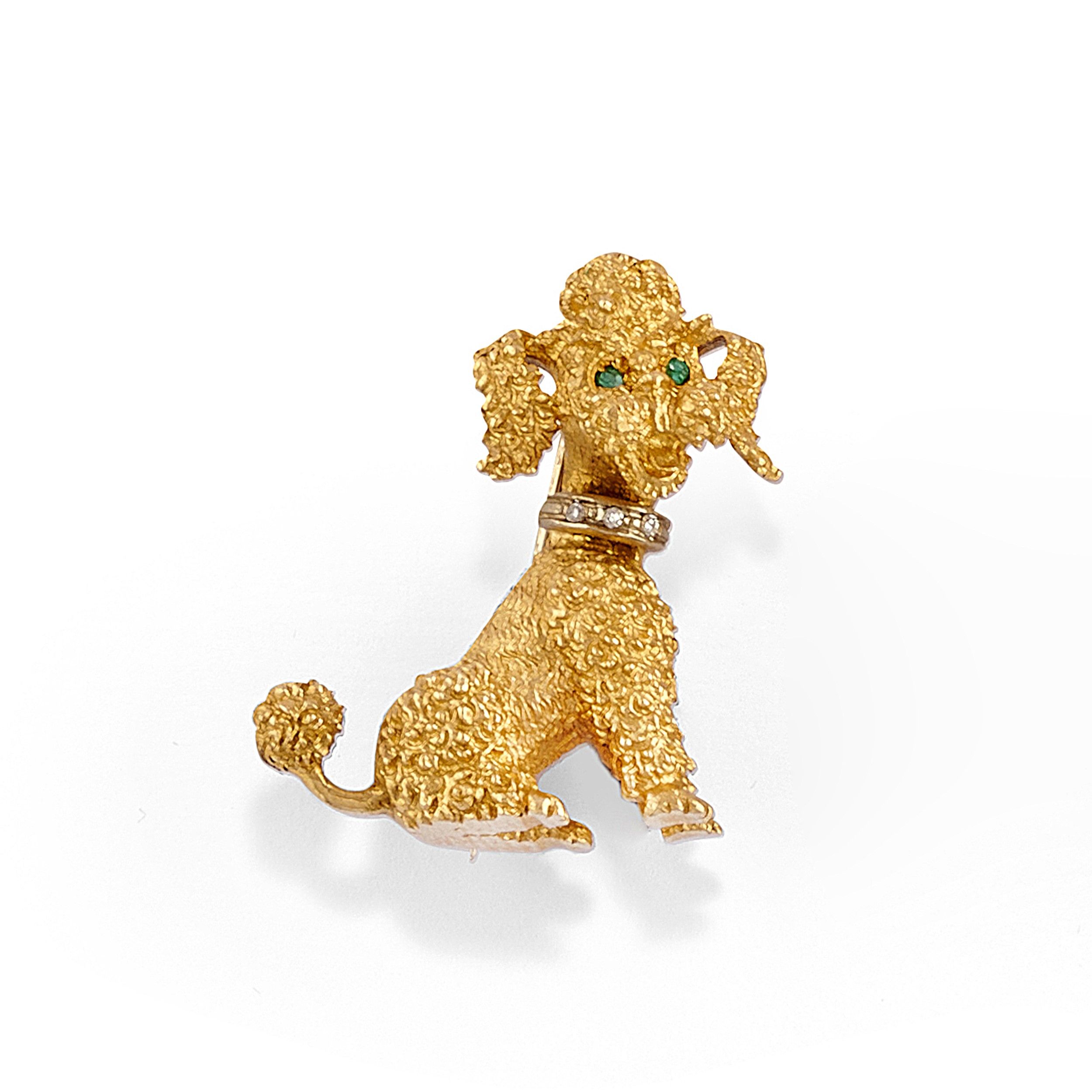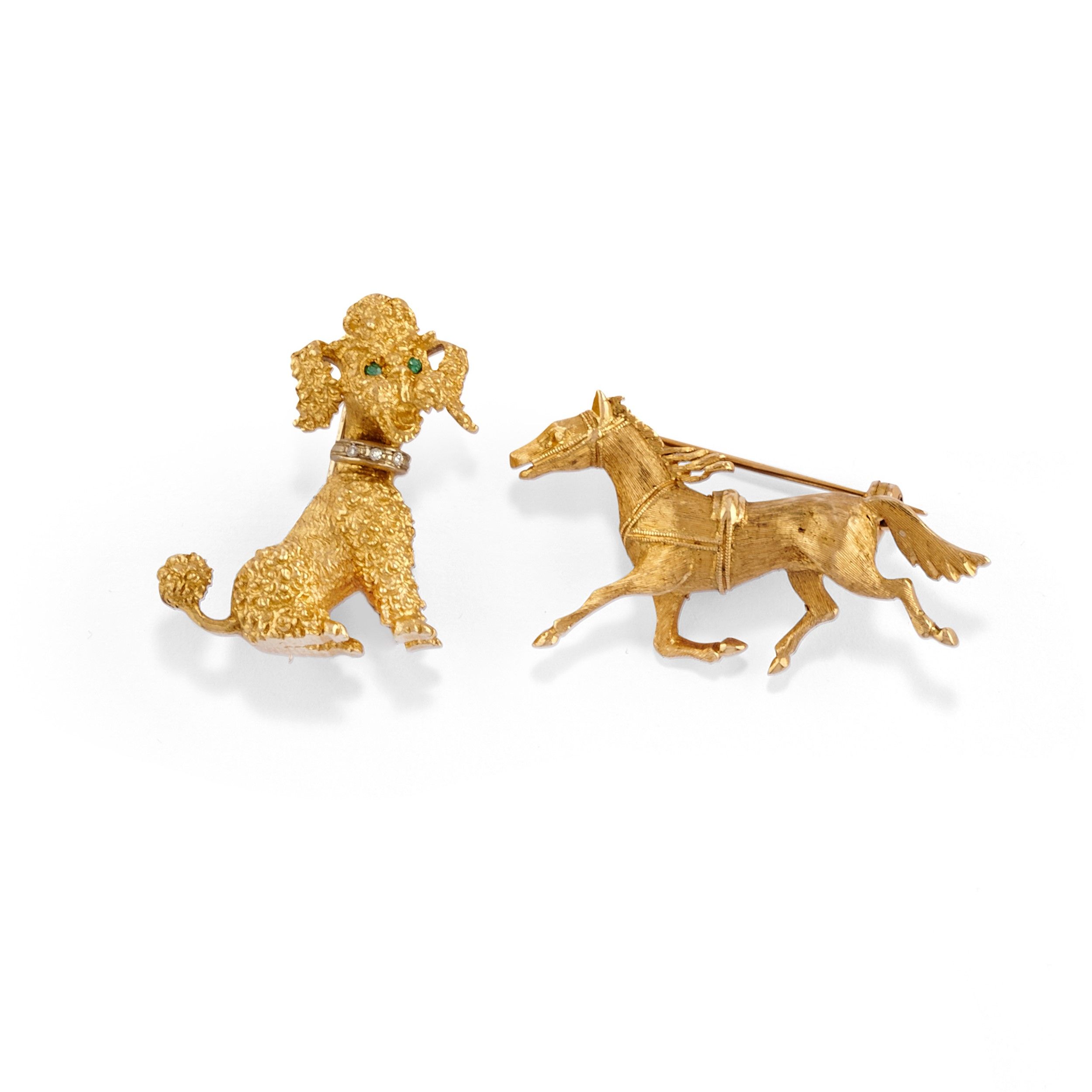 raffiguranti barboncino e cavallo, diamanti taglio huit-huit e smeraldi taglio rotondo.
