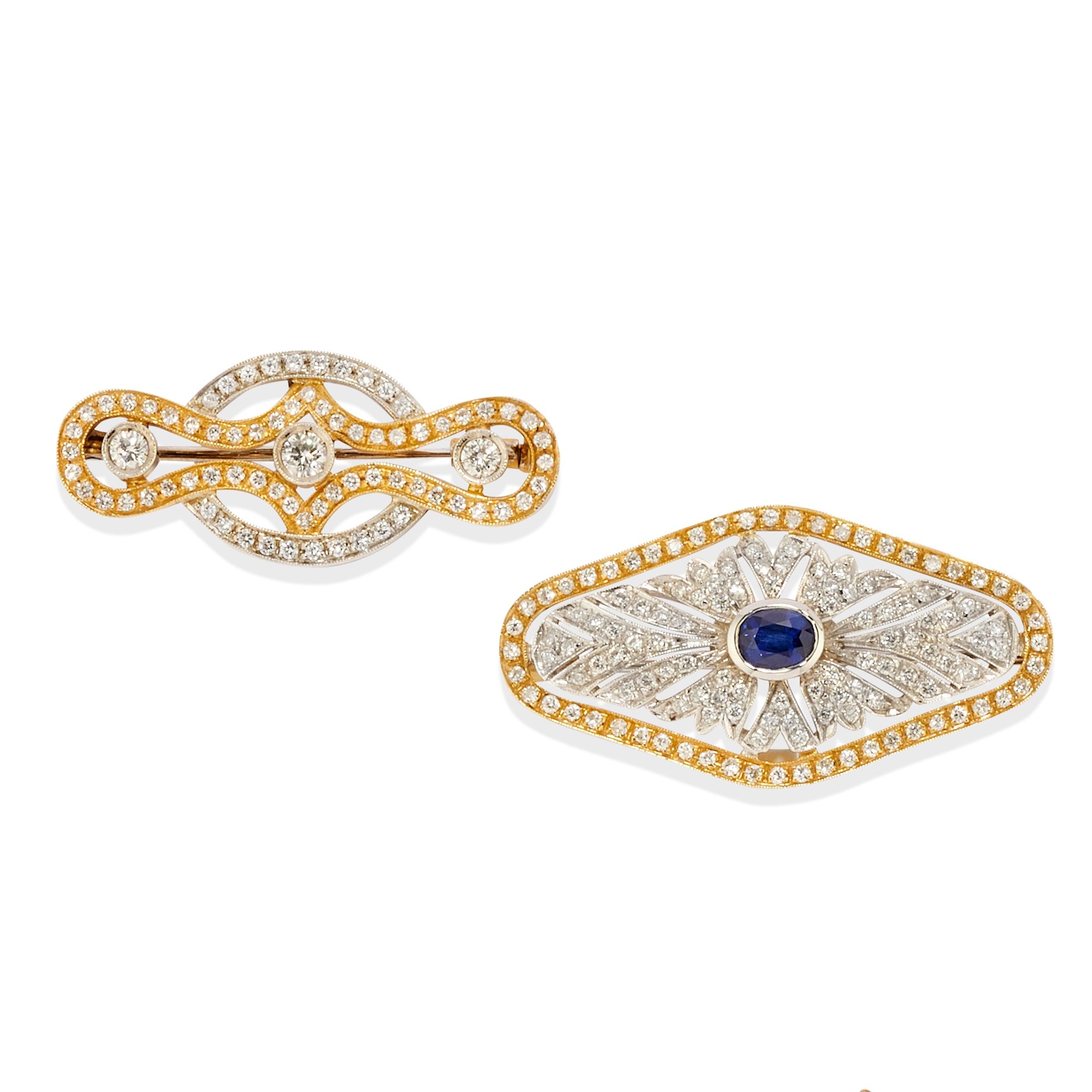una interamente decorata da diamanti taglio brillante, l'altra con al centro zaffiro taglio ovale e diamanti taglio brillante.