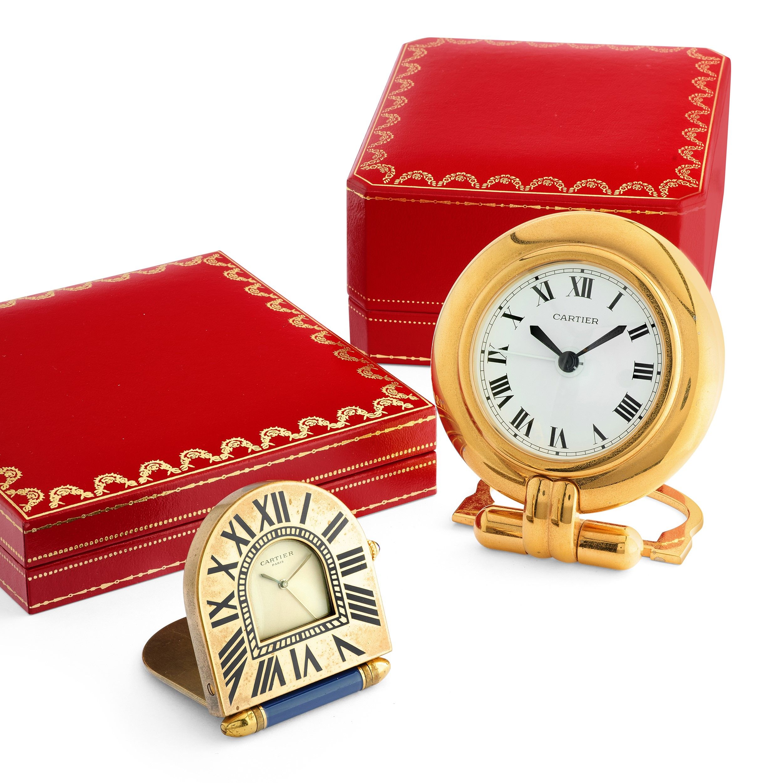 una di forma rotonda con quadrante chiaro e numeri romani in smalto nero, con scatola e garanzia e una di forma arcuata con decoro in lacca blu, quadrante chiaro privo di indici, con scatola, movimenti al quarzo.