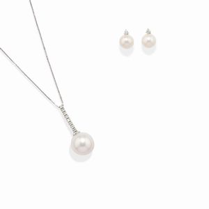 in oro bianco 18k, Peso g 6,70 cm 40,00 pendente con perla coltivata di mm 11,00 circa e diamanti taglio brillante [..]