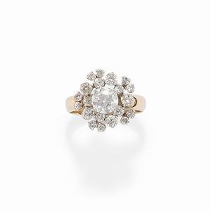 in oro bicolore 18k, Peso g 6,50 misura 13 al centro quattro diamanti taglio brillante per totale ct 1,40 circa, [..]