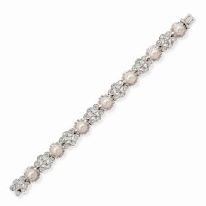 in oro bianco 18k, Peso g 32,70 cm 7,00 composta da bracciale con maglia elasticizzata con perle coltivate e diamanti [..]