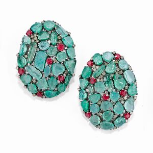 in argento, oro giallo 14k e 18k, Peso g 22,00 cm 3,00x4,00 di forma ovale con smeraldi di differenti tagli per [..]