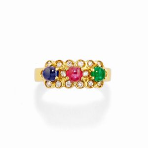 in oro giallo 18k, Peso g 5,60 misura 10 motivi a fiore con smeraldo, rubino e zaffiro taglio rotondo cabochon [..]