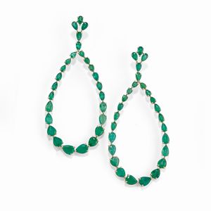 in oro giallo 14k, Peso g 13,60 cm 3,30x7,50 realizzati a grandi gocce con smeraldi taglio goccia per totale ct [..]