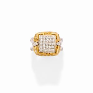 in oro bicolore 18k, Peso g 17,10 misura 17 squadrato con diamanti taglio brillante per totale ct 2,20 circa.