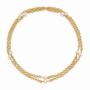 in oro giallo 18k, Peso g 41,60 cm 82,00 maglia a gabbia in filo d'oro ritorto, con perle coltivate di mm 7,00 [..]