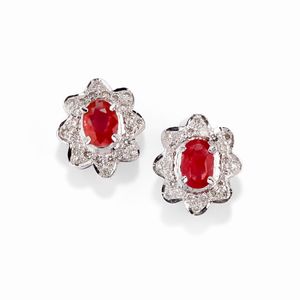 in oro bianco 18k, Peso g 5,90 cm 1,30x1,50 realizzati a fiore con rubini taglio ovale per totale ct 1,60 circa, [..]