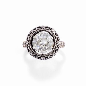 in argento e oro, Peso g 3,26 misura 8 inizio XX secolo al centro un diamante taglio vecchio di ct 1,80 circa [..]