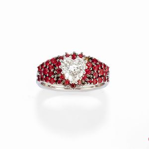 in oro bianco e brunito 18k, Peso g 7,50 misura 15 al centro un diamante taglio cuore di ct 1,04, colore J, purezza [..]