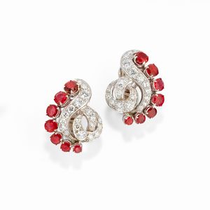 in oro bianco 18k, Peso g 12,60 cm 1,90x2,40 realizzati a voluta, con rubini taglio rotondo per totale ct 3,00 [..]