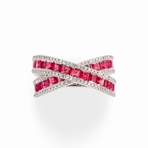 in oro bianco 18k, Peso g 5,80 misura 13 a fascia intrecciata, rubini taglio carrè per totale ct 2,00 circa e [..]