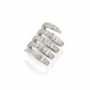 in oro bianco 18k, Peso g 8,70 misura 15 a serpente, impreziosito da diamanti taglio baguette per totale ct 2,50 [..]