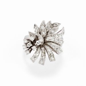 in oro bianco 18k, Peso g 7,55 misura 15 realizzato a fiore con decoro in diamanti taglio huit-huit.