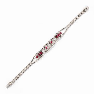 in oro bianco 18k, Peso g 27,00 cm 18,50 maglia a catena decorata con rubini taglio rotondi e al centro diamante [..]