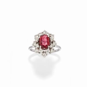 in platino, Peso g 4,70 misura 11 al centro rubino taglio ovale di ct 1,39 (caratura incisa), diamanti taglio [..]