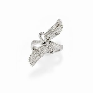 in oro bianco 18k, Peso g 7,30 misura 15 con due foglie disposte a contrariè con diamanti taglio baguette e brillante [..]