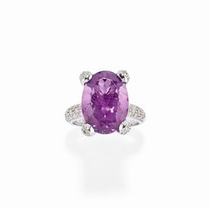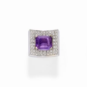 in oro bianco 18k, Peso g 7,10 misura 14 al centro ametista taglio ovale e decoro in diamanti taglio brillante [..]