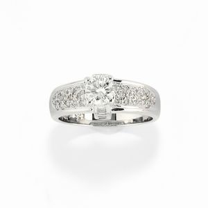 in oro bianco 18k, Peso g 4,50 misura 11 al centro diamante taglio brillante ct 0,48, ai lati diamanti taglio [..]
