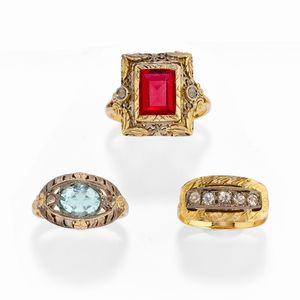 in oro bicolore 18k, Peso g 21,50 misure 14, 17, 21 uno con topazio azzurro taglio fantasia e piccoli diamanti [..]