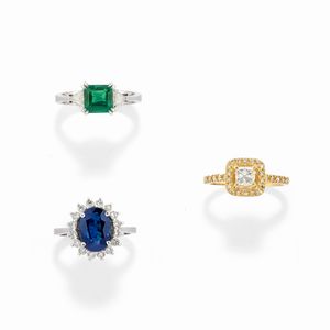 in oro bianco 18k, Peso g 4,50 misura 14 realizzato a contrarié con zaffiro e smeraldo taglio goccia per totale [..]