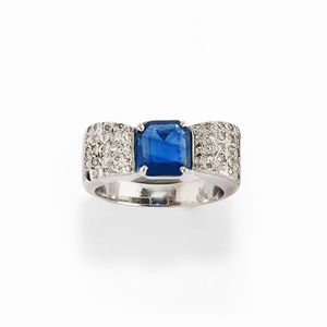 in oro bianco 18k, Peso g 8,40 misura 16 al centro zaffiro taglio quadrangolare a contorno ottagonale di ct 1,00 [..]