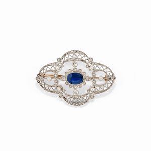 in oro bicolore 18k, Peso g 8,90 cm 3,00x4,00 a losanga, decoro a milligrano con al centro zaffiro taglio ovale [..]