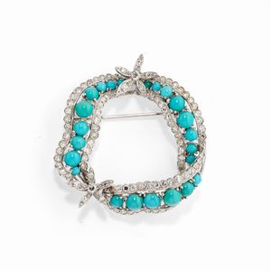 in oro bianco 18k, Peso g 12,00 cm 1,60x2,30 di forma stilizzata, con turchesi taglio ovale cabochon e diamanti [..]