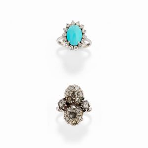 in oro bianco 18k, Peso g 12,30 misure 16-13 uno a fiore con turchese taglio ovale cabochon entro giro di diamanti [..]