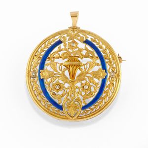 in oro giallo, Peso g 14,80 diametro cm 4,50 di forma rotonda, interamente traforata e decorata in smalto blu, [..]