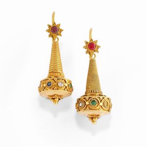 in oro giallo 18k, Peso g 13,80 cm 1,50x4,50 di forma conica, decoro in filo d'oro ritorto, pietre incolore sintetiche [..]