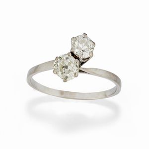 in oro bianco 18k, Peso g 2,70 misura 21 a contrarié con due diamanti taglio vecchio per totale ct 1,00 circa, [..]